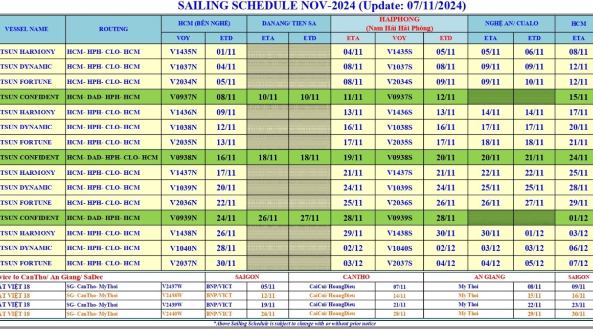 Vietsun domestic shipping schedule for November 2025 (updated on November 20, 2025). For details, please see the attached file.
