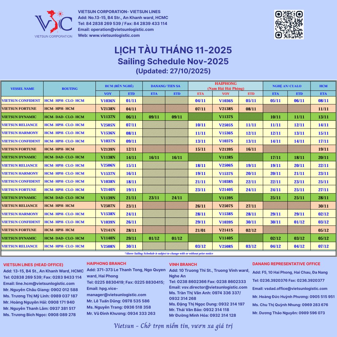28October28/10/2025Vietsun domestic container ship schedule November 2025 (updated October 27, 2025)Vietsun domestic shipping schedule for November 2025 (updated on October 27, 2025). For details, please see the attached file.0by adminin Schedules
