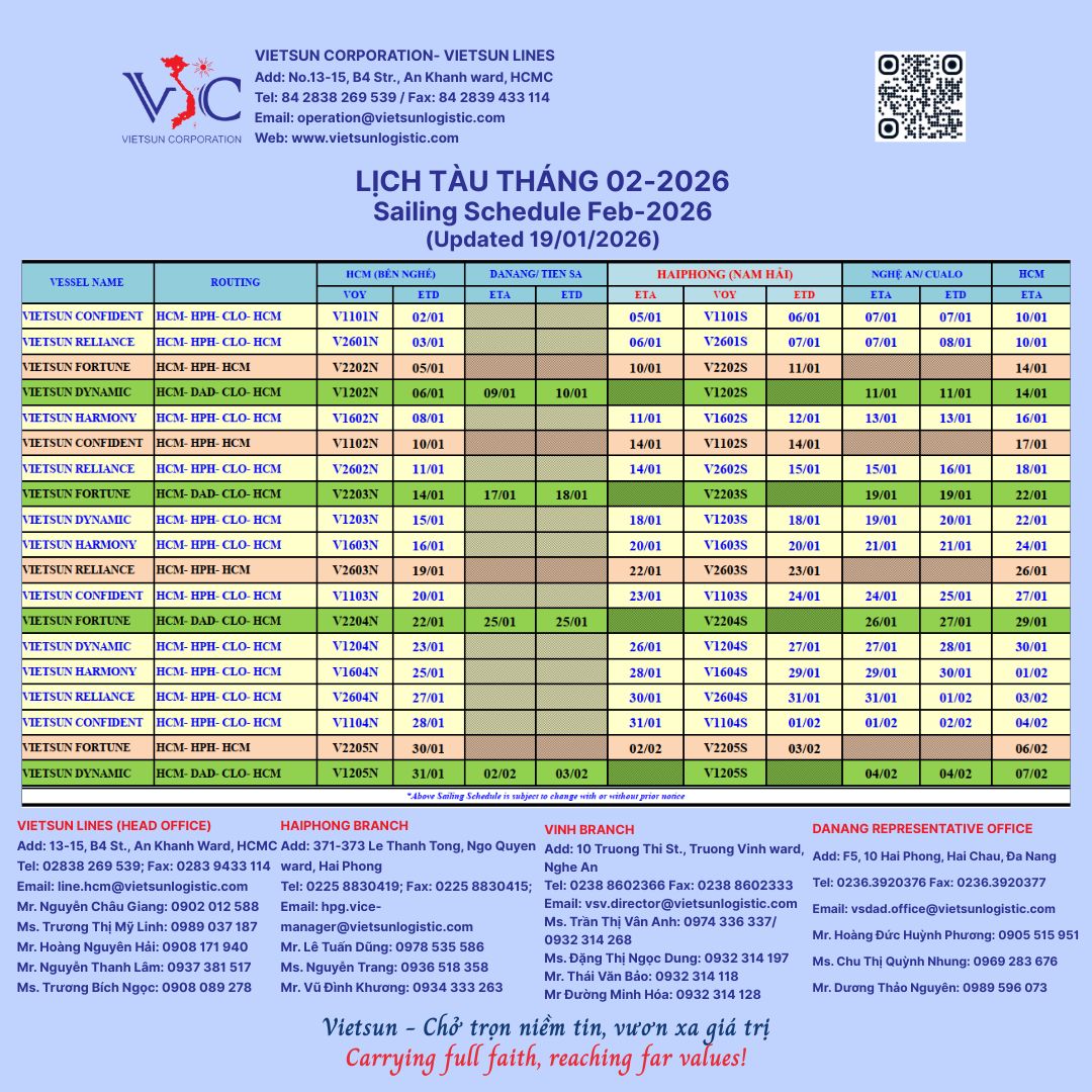 Vietsun Domestic Shipping Schedule for the Lunar New Year (February 2026) (updated January 12, 2026). Please see the attached file for details.