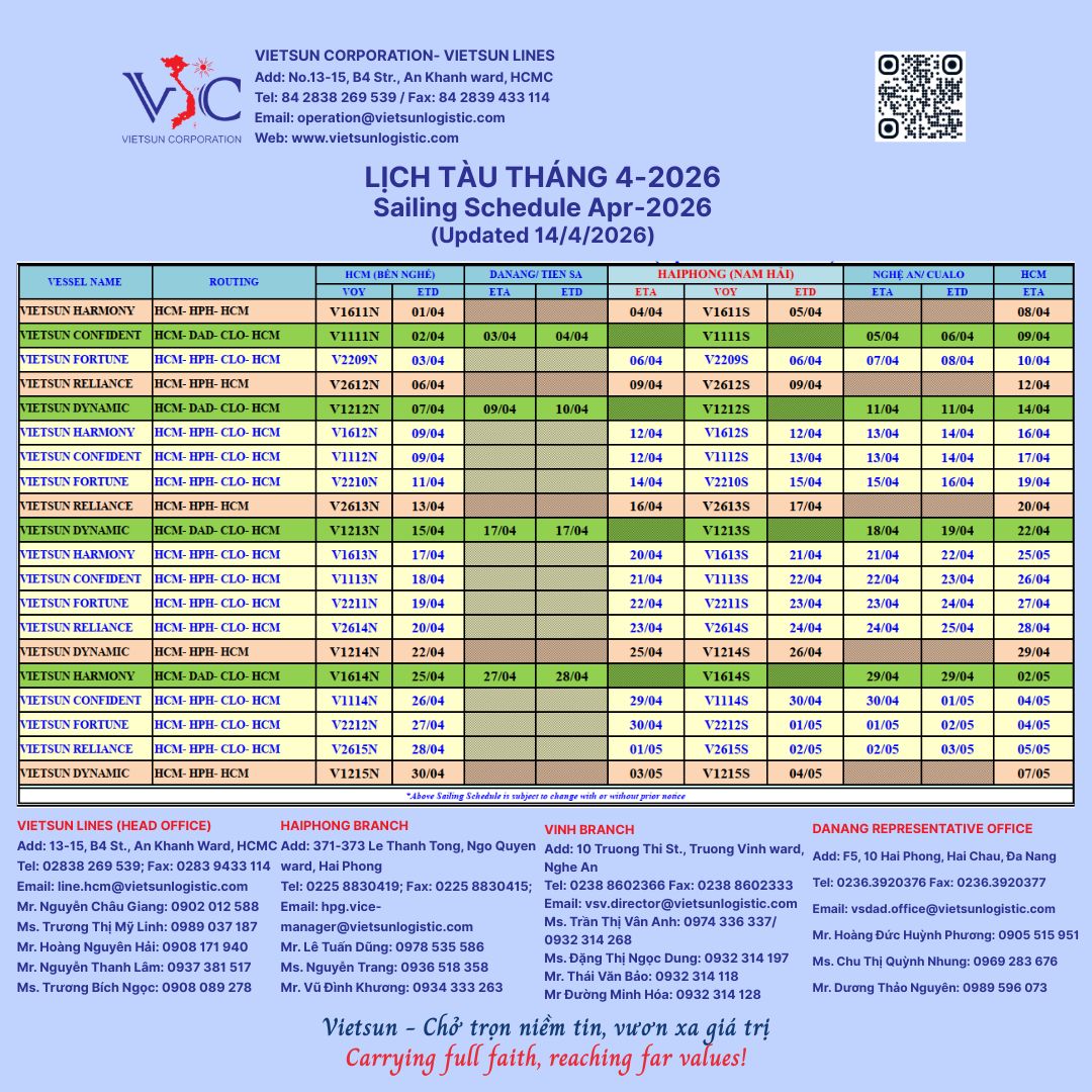 Lịch tàu vận tải biển nội địa Vietsun tháng 4/2026 (cập nhật ngày 14/4/2026), chi tiết vui lòng xem file đính kèm.