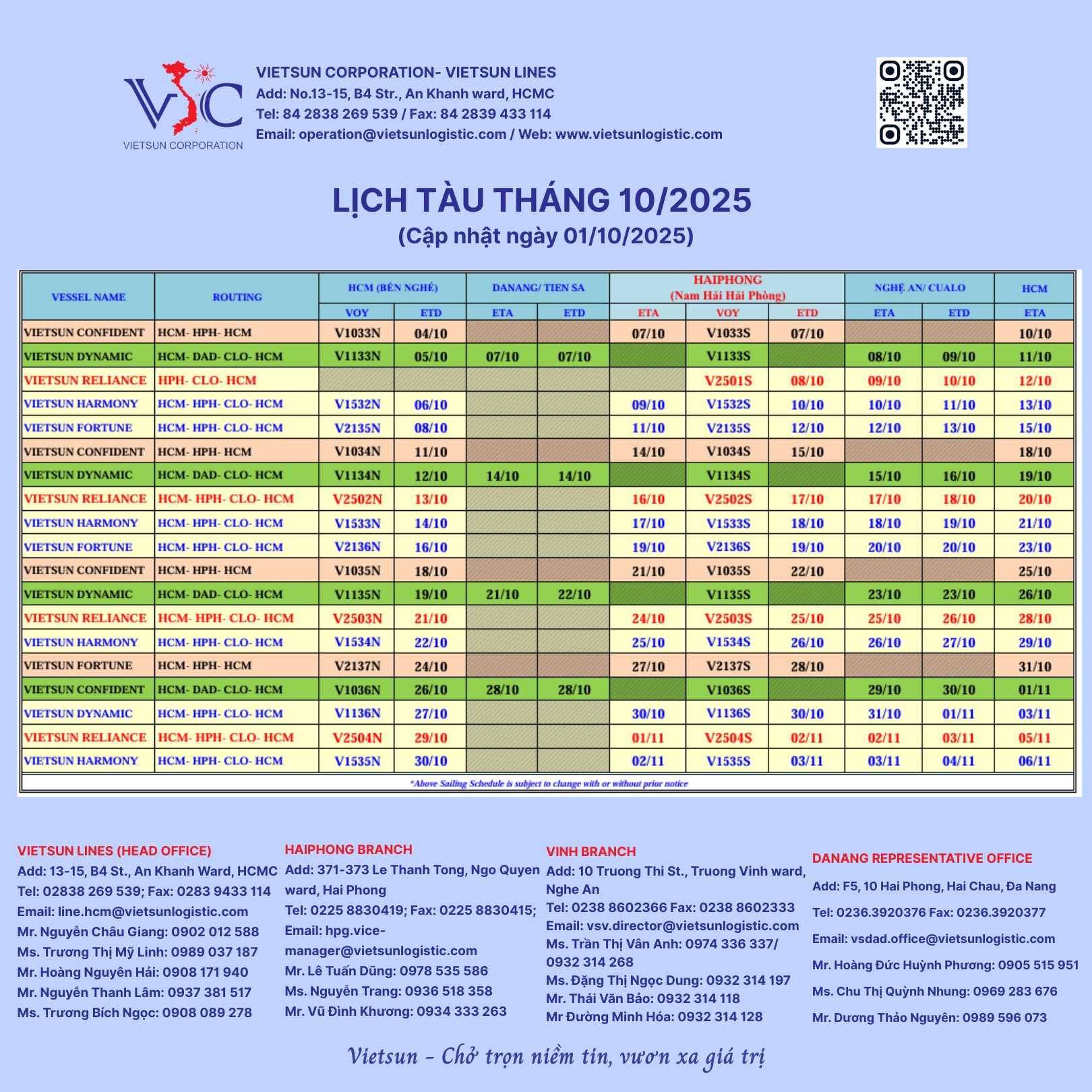 Lịch tàu vận tải biển nội địa Vietsun tháng 10/2025 (cập nhật ngày 01/10/2025), theo đó đưa vào khai thác tàu MV Vietsun Reliance, tuyến HPH – CLO – HCM (Hải Phòng – Cửa Lò – Hồ Chí Minh) và tuyến HCM-HPH-CLO-HCM (Hồ Chí Minh – Hải Phòng – Cửa Lò – Hồ Chí Minh). Chi tiết vui lòng xem file đính kèm.