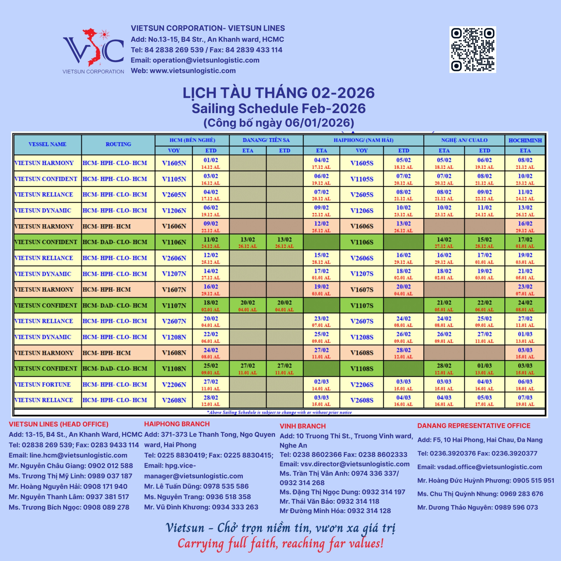 Lịch tàu vận tải biển nội địa Tết Nguyên đán Bính Ngọ 2026 của Hãng tàu Vietsun (công bố ngày 06/01/2026)