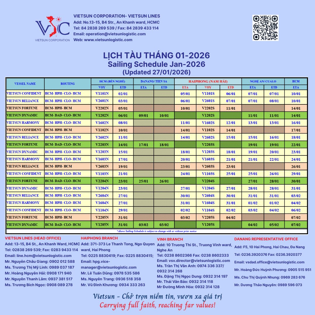 Lịch tàu vận tải biển nội địa Vietsun Tết Nguyên đán Bính Ngọ – tháng 01/2026 (cập nhật ngày 27/01/2026), theo đó, bổ sung kế hoạch tàu Vietsun Harmony V1604; thông tin tàu VSF.2205S cập cảng Chu Lai (HPG- ChuLai- HCM). Chi tiết vui lòng xem file đính kèm.
