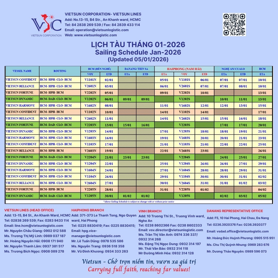 Lịch tàu vận tải biển nội địa Vietsun tháng 01/2026 (công bố ngày 22/12/2025). Chi tiết vui lòng xem file đính kèm