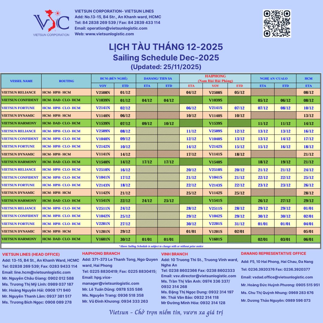 Lịch tàu vận tải biển nội địa Vietsun tháng 12/2025 (cập nhật ngày 25/11/2025). Chi tiết vui lòng xem file đính kèm.