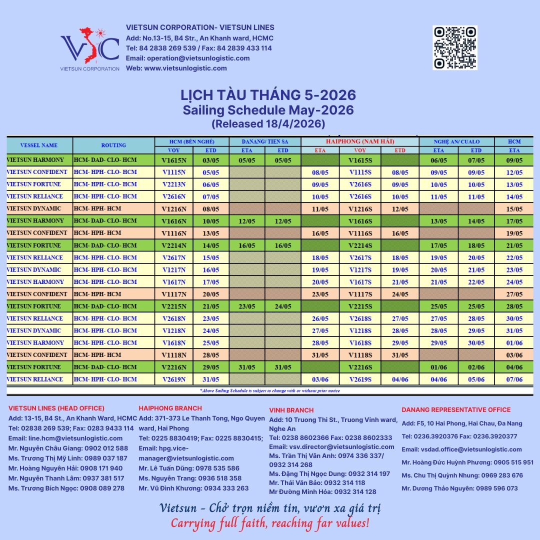 Lịch tàu vận tải biển nội địa Vietsun tháng 5/2026 (công bố ngày 18/4/2026), chi tiết vui lòng xem file đính kèm.